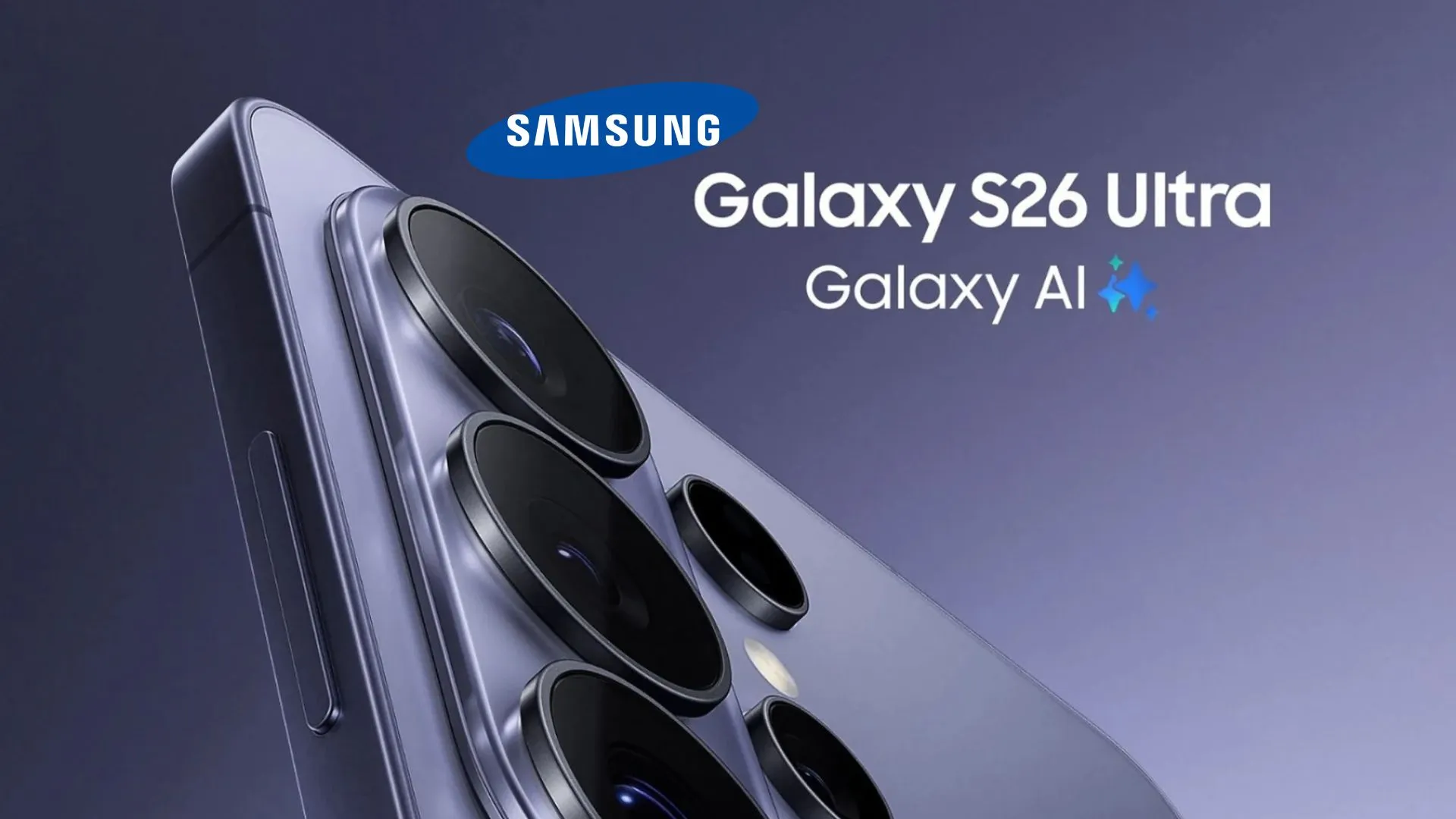 Bocoran poster resmi Samsung Galaxy S26 Ultra warna ungu menampilkan desain modul kamera baru tiga tingkat yang menyatu dengan dukungan fitur Galaxy AI.