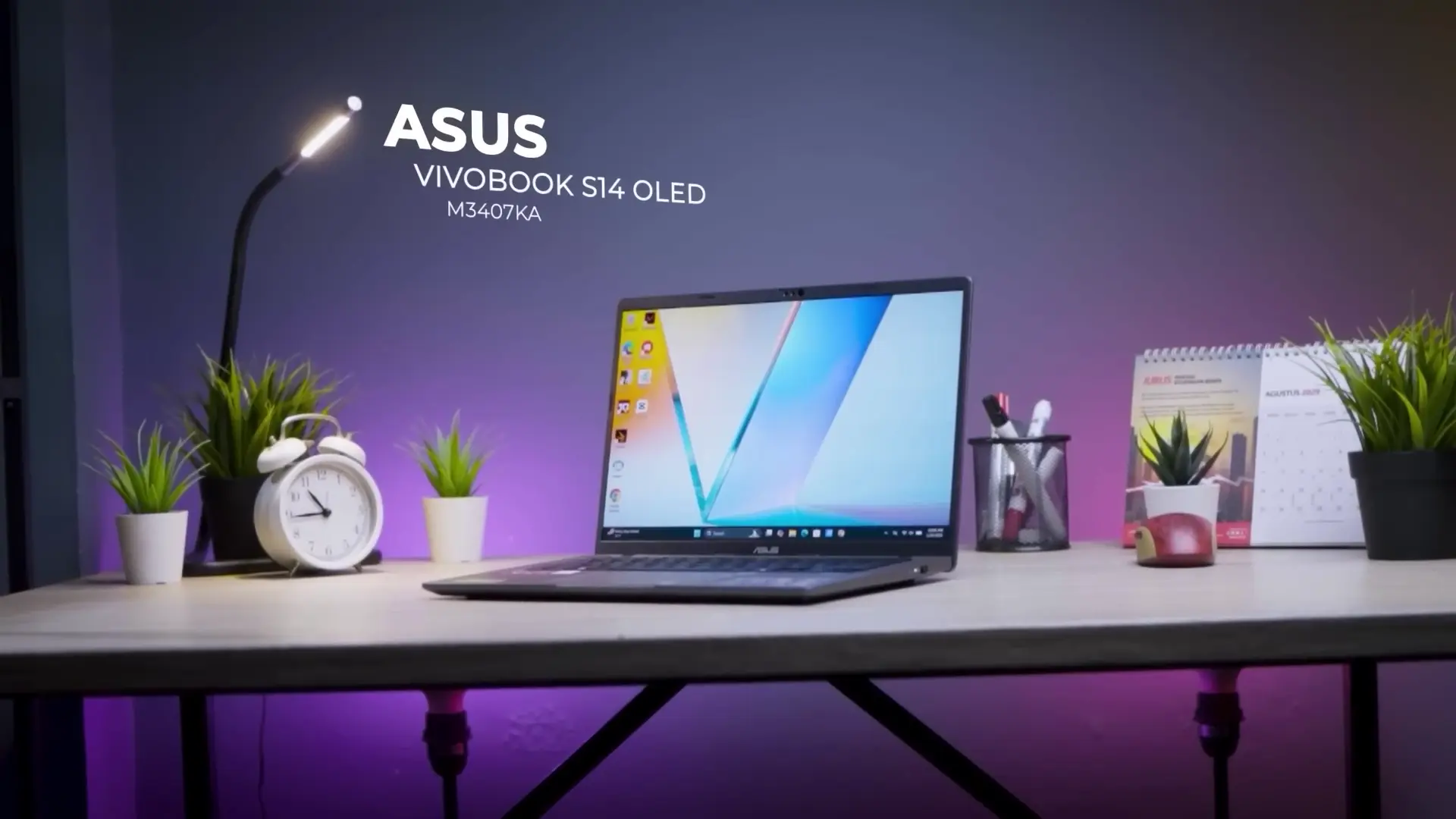 Laptop ASUS Vivobook S14 OLED M3407KA dengan desain tipis dan layar OLED jernih di atas meja kerja.
