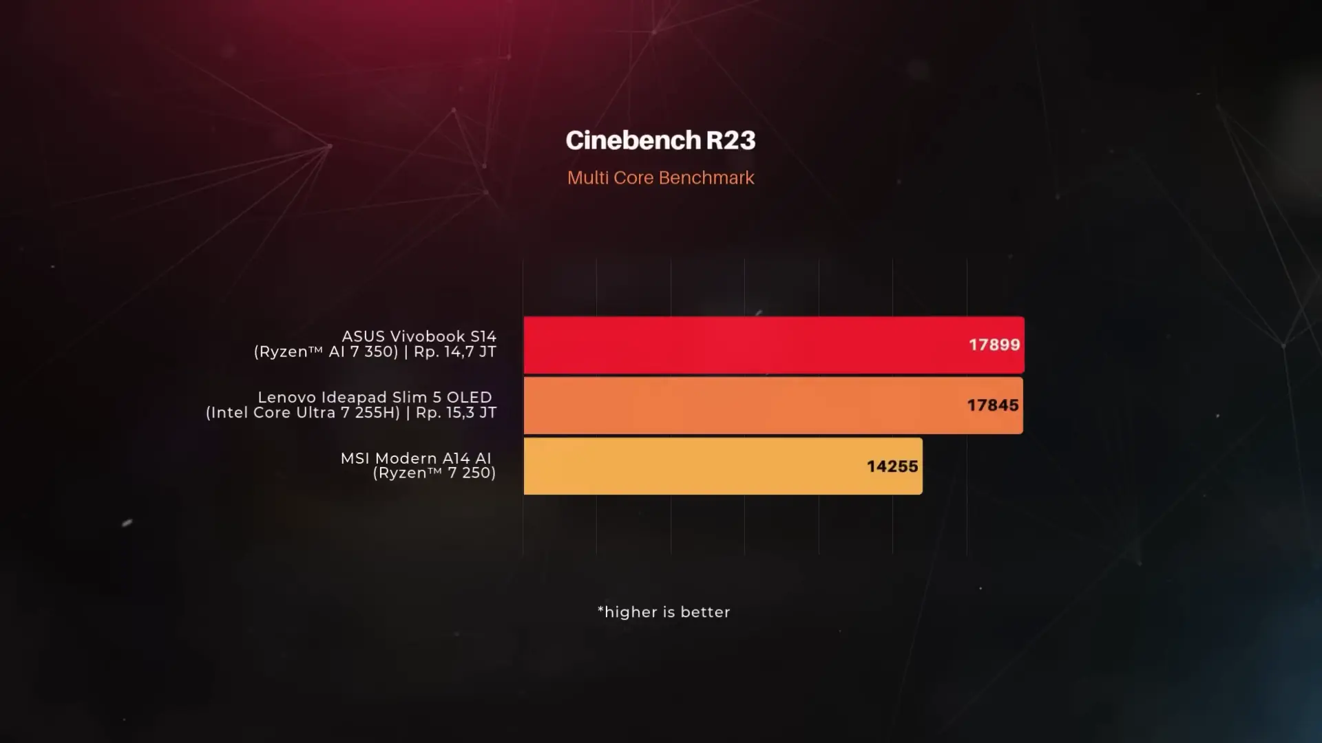 Dalam sesi uji performa menggunakan Cinebench R23 Multi Core, ASUS Vivobook S14 OLED M3407KA mencatatkan skor 17.899 poin. Angka ini berhasil mengungguli kompetitor seperti Lenovo Ideapad Slim 5 yang menggunakan Intel Core Ultra 7 255H, meskipun harga ASUS jauh lebih terjangkau di angka Rp14,7 Juta.