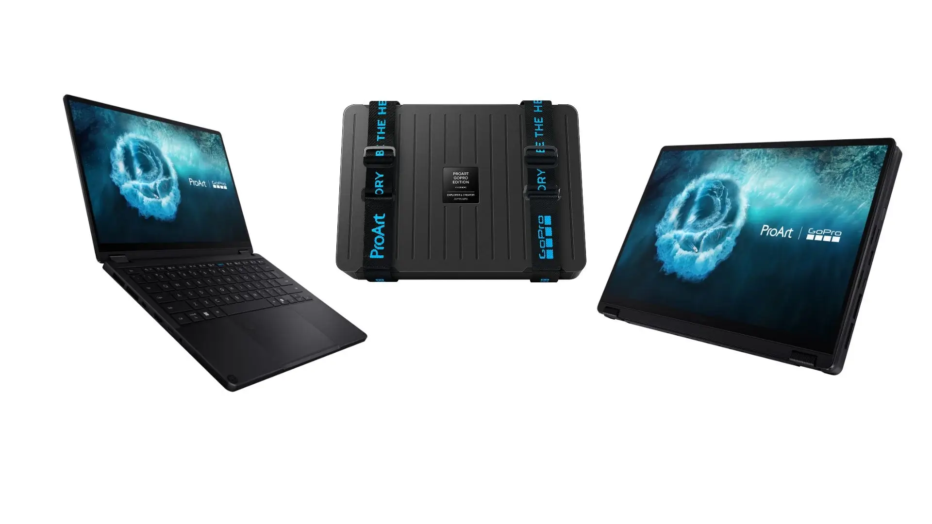 Tiga sudut pandang laptop ASUS ProArt GoPro Edition mode standar, mode tablet, dan koper suitcase kolektor.