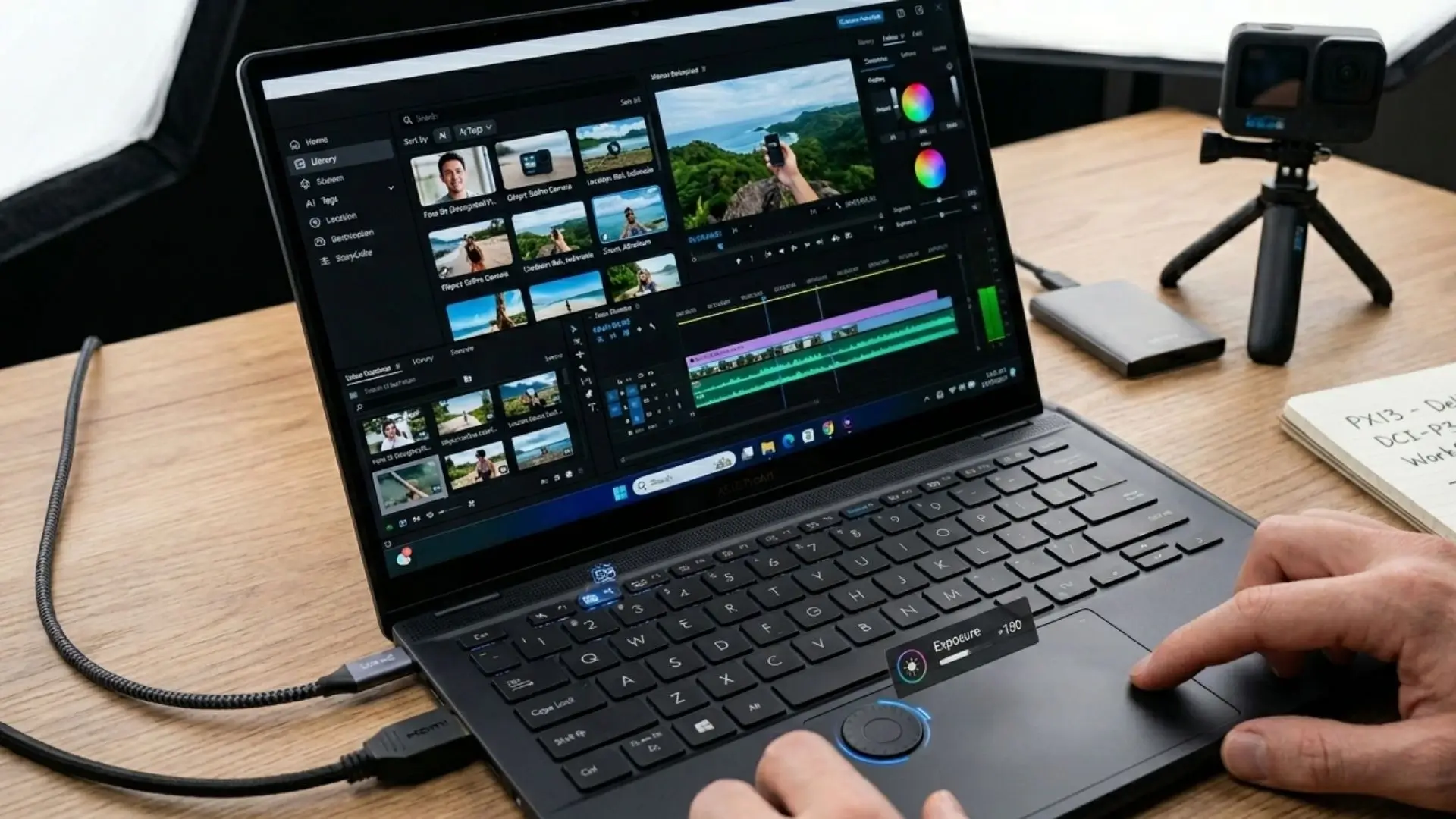 Tampilan layar ASUS Lumina OLED pada laptop ASUS ProArt GoPro Edition yang sedang menjalankan aplikasi editing video dengan kontrol DialPad.