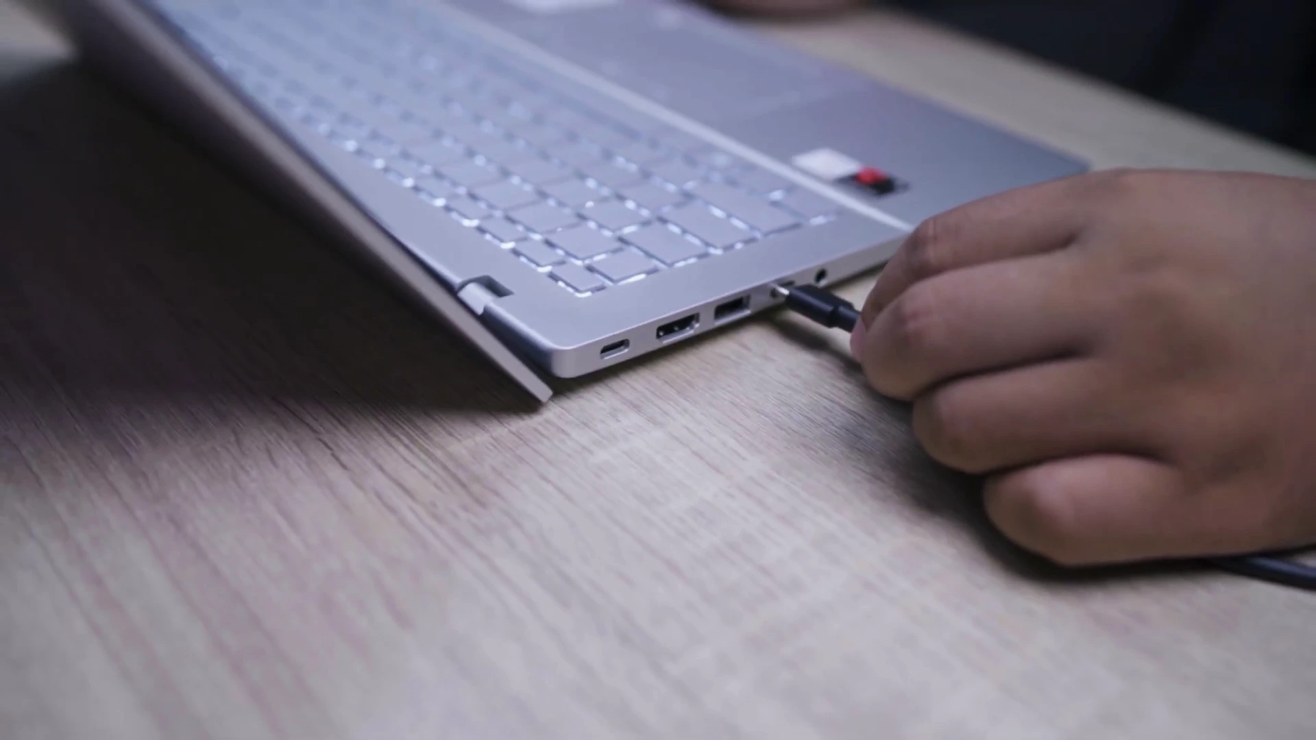 Close-up tangan pengguna mencolokkan kabel charger USB-C ke port Power Delivery pada Laptop AI ASUS Vivobook S14 yang memiliki baterai 70Wh untuk mendukung produktivitas tanpa batas hingga 20 jam.